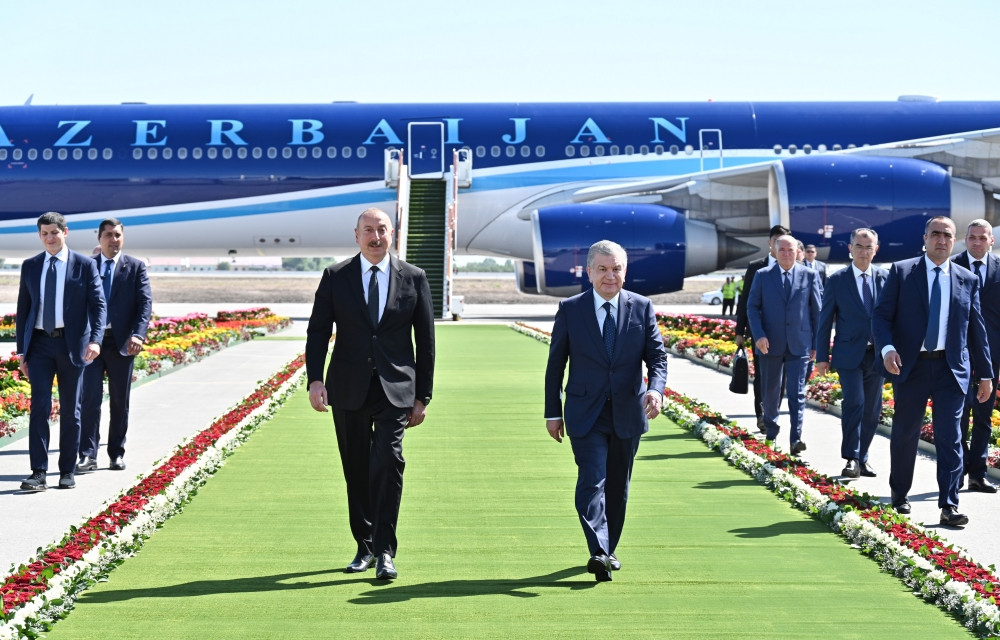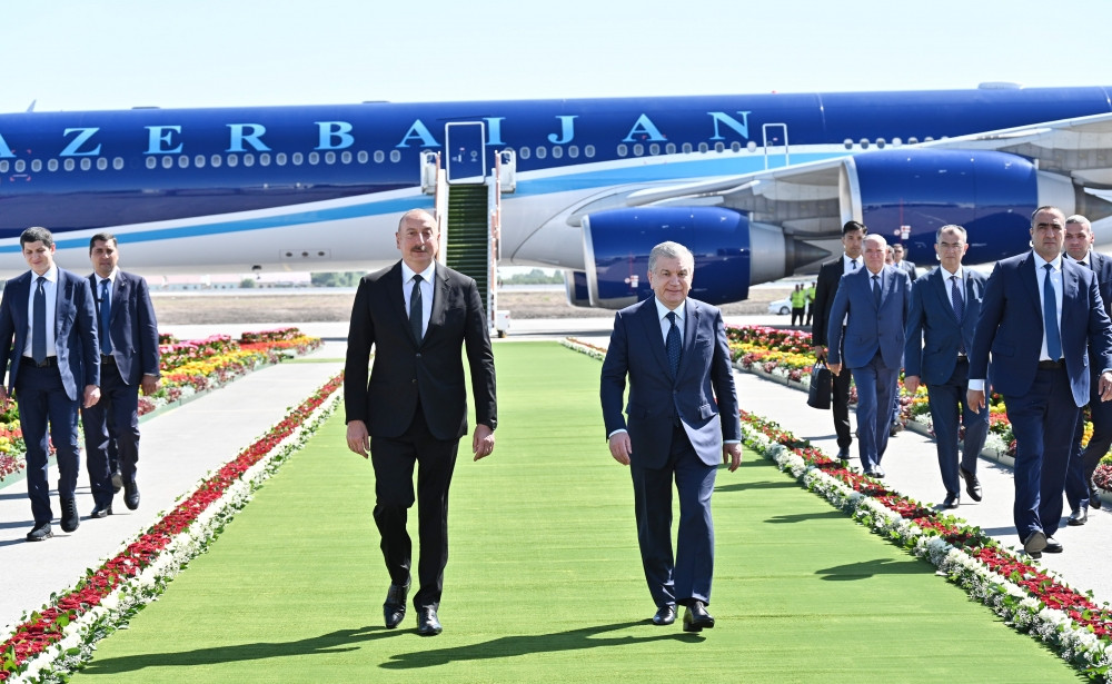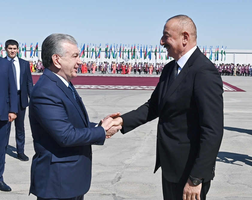 President Ilham Aliyev was welcomed by President of the Republic of Uzbekistan Shavkat Mirziyoyev at Urgench International Airport decorated with the national flags of the two countries.