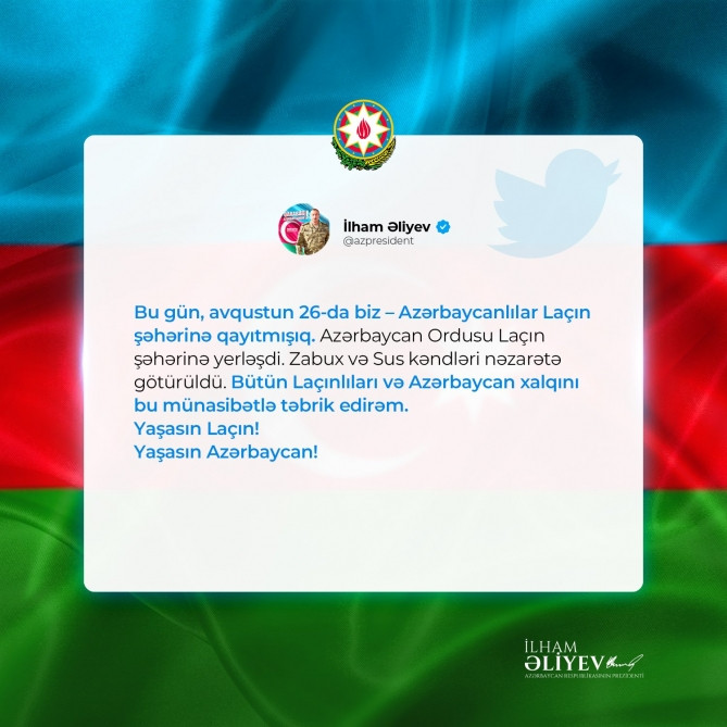 First Vice President of the Republic of Azerbaijan, Mehriban Aliyeva, shared a post on her Instagram page about the stationing of the Azerbaijani Army in the city of Lachin and the taking control of the villages of Zabukh and Sus, Report informs.
