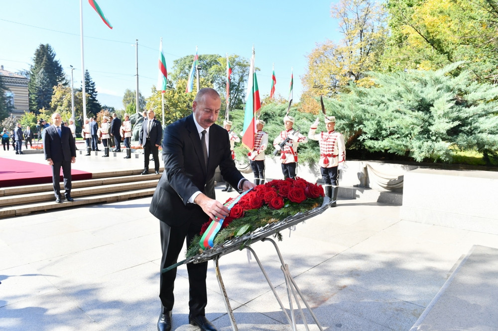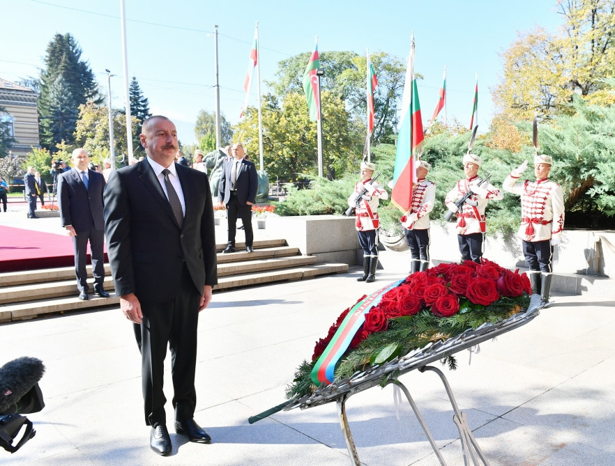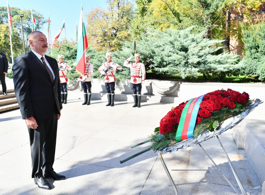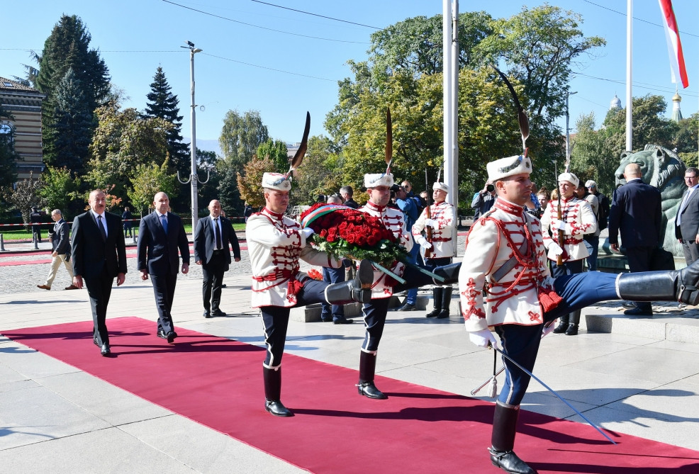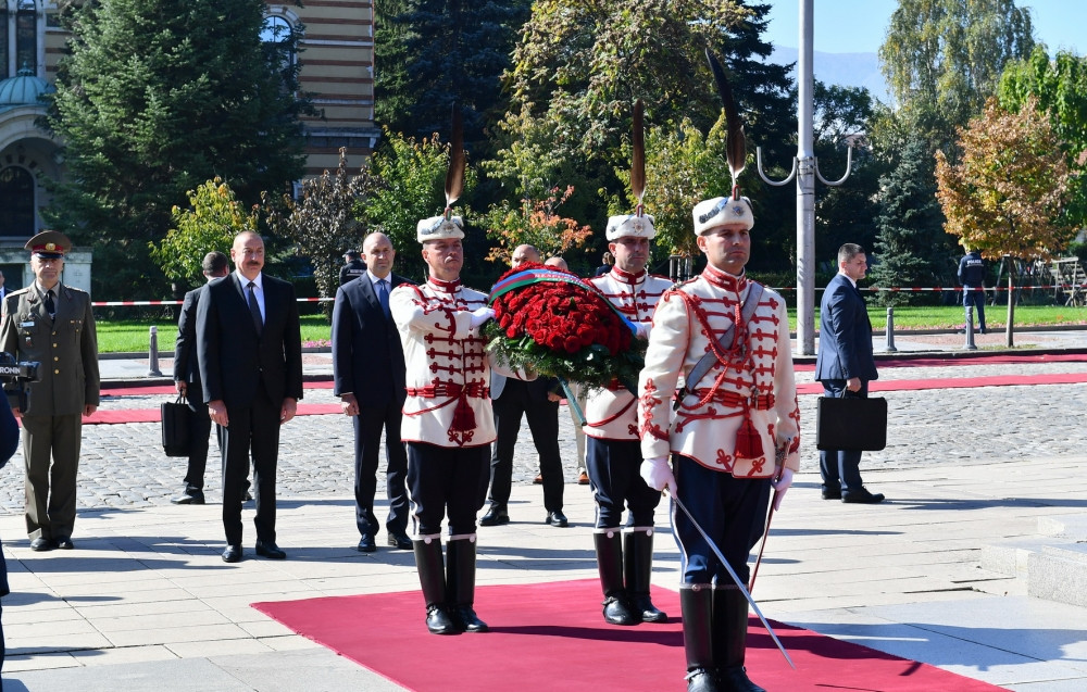 Following the official welcome ceremony, President of the Republic of Azerbaijan Ilham Aliyev has visited the tomb of the Unknown Soldier at the Alexander Nevsky Square in Sofia.