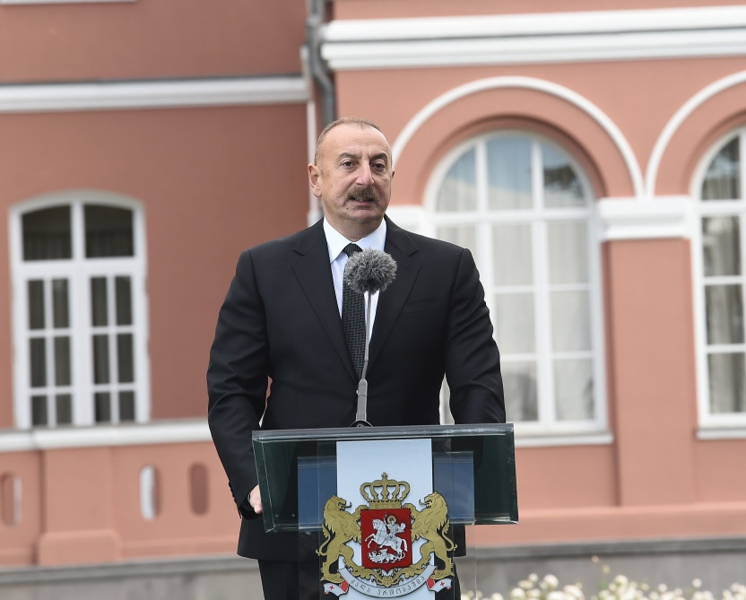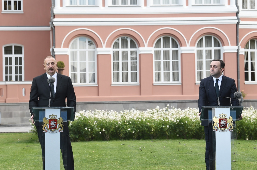 After viewing the “Heritage of Karabakh Khanate” exhibition at Château Mukhrani, Mtskheta Municipality, President of the Republic of Azerbaijan Ilham Aliyev and Prime Minister of Georgia Irakli Garibashvili have made press statements.