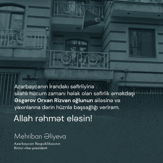 The post says: “I offer my deep condolences to the relatives and friends of our compatriot, senior lieutenant Asgarov Orkhan Rizvan oglu, who was killed during the terrorist attack against our embassy in Tehran today. May Allah rest his soul in peace! I pray for the speedy recovery of the injured. May God bless the people of Azerbaijan!”