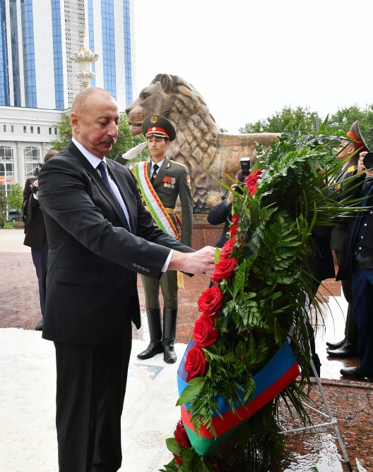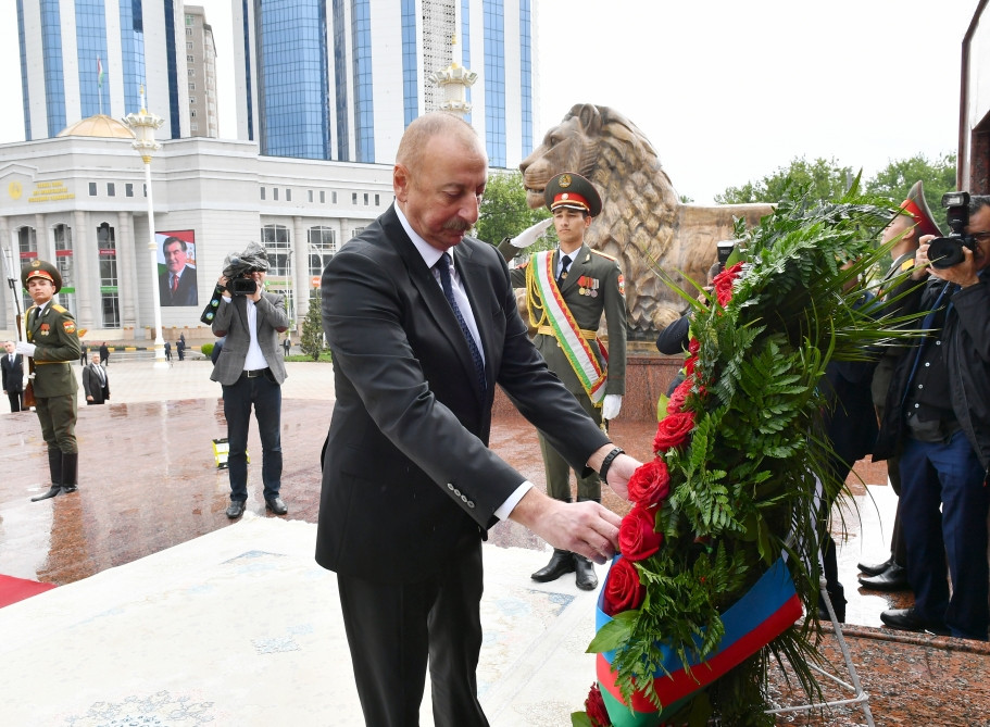 President of the Republic of Azerbaijan Ilham Aliyev has visited a statue of Ismoil Somoni in the Memorial Complex of National Solidarity and Revival of Tajikistan at Dusti Square in Dushanbe.