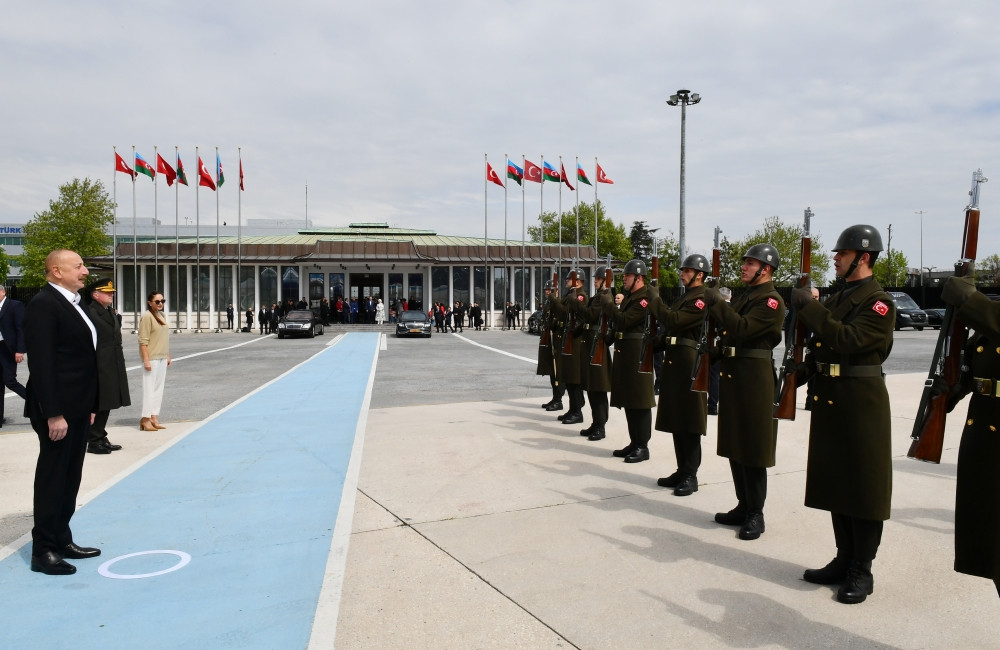 A guard of honor was lined up for the President of Azerbaijan at Istanbul Atatürk Airport decorated with the national flags of the two countries.