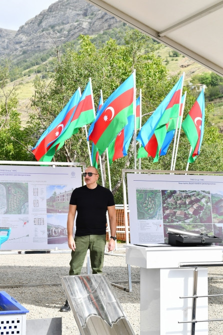 President of the Republic of Azerbaijan Ilham Aliyev has examined the reconstruction works to be carried out in the village of Dashalti of the Shusha district, and laid the foundation stone for a new residential complex and tourist facilities to be built at the expense of private investment in the village.