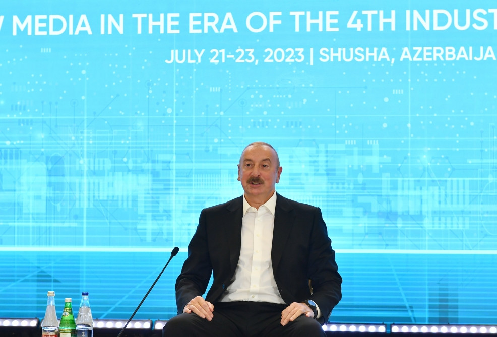 President of the Republic of Azerbaijan Ilham Alliyev is addressing the participants of the Global Media Forum on “New Media in the Era of the 4th Industrial Revolution” in Shusha.
