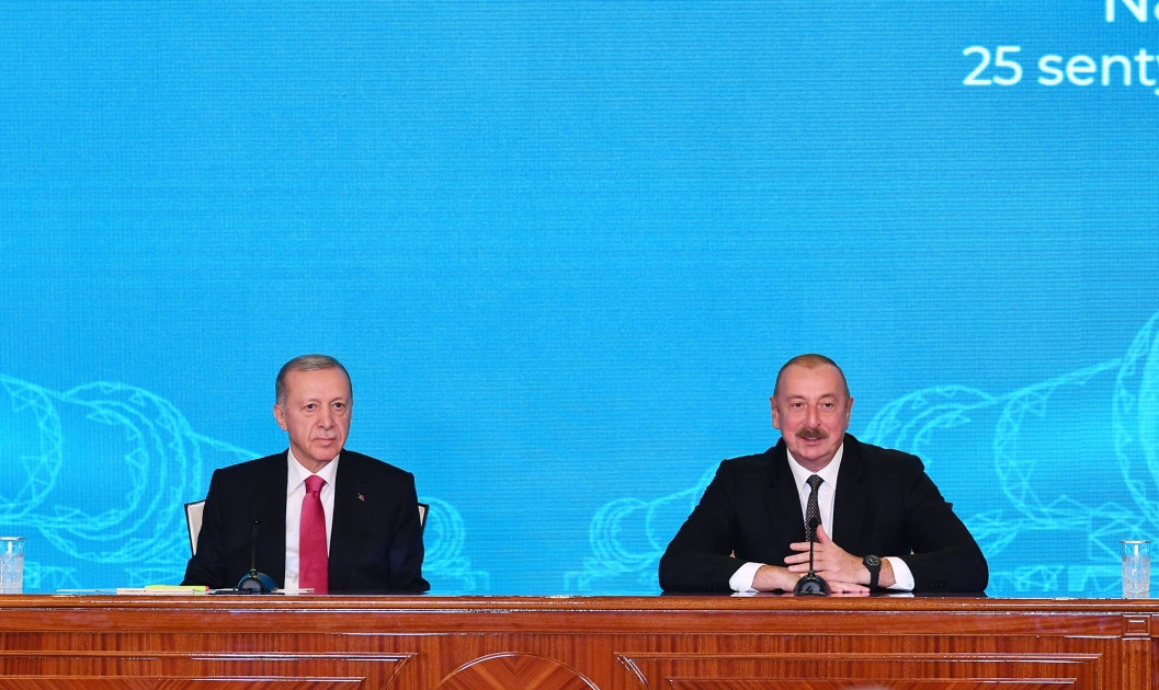Following the ceremony of signing documents, President of the Republic of Azerbaijan Ilham Aliyev and President of the Republic of Türkiye Recep Tayyip Erdogan are making press statements.