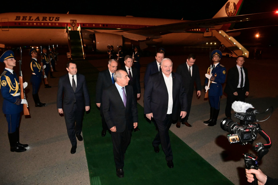 A guard of honor was lined up for the Belarus President at Heydar Aliyev International Airport decorated with the national flags of the two countries.