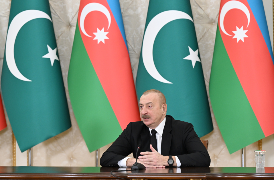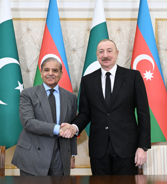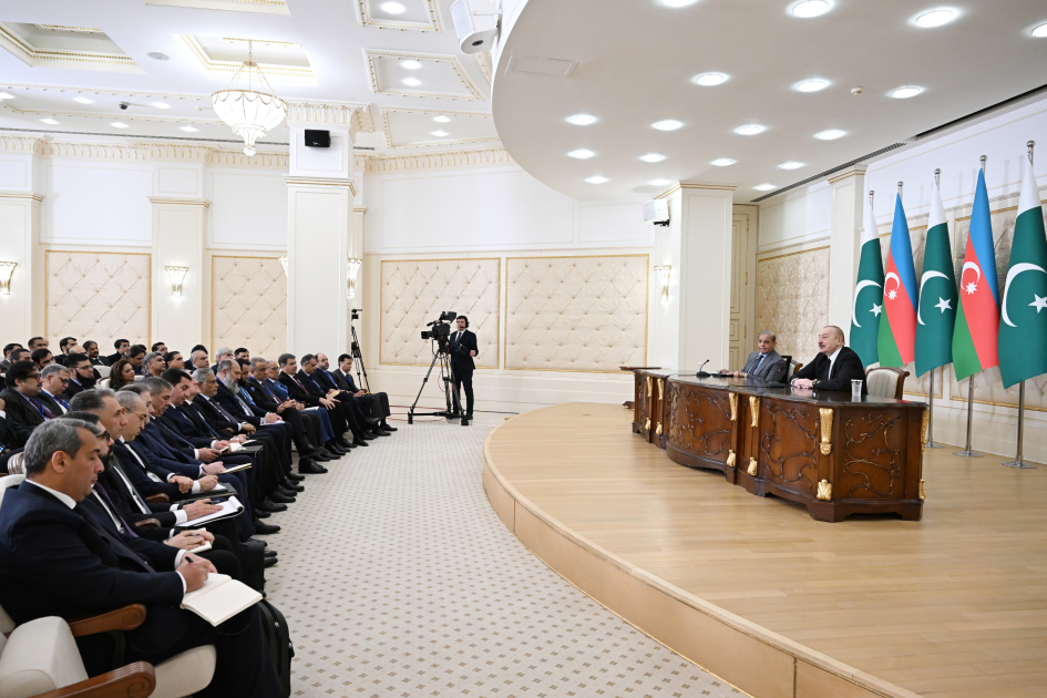 President of Azerbaijan Ilham Aliyev and Prime Minister of Pakistan Muhammad Shehbaz Sharif are making press statements