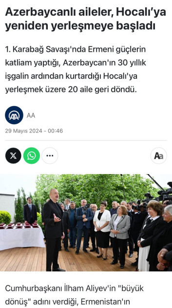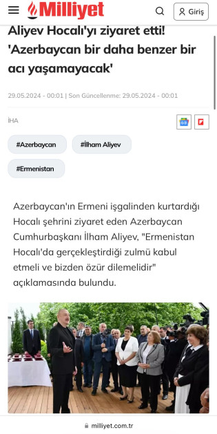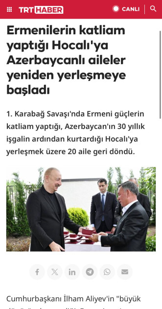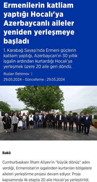 “Əliyev Xocalıya səfər etdi!”, “Azərbaycan bir daha belə acı yaşamayacaq”, “Ermənilərin soyqırımı törətdiyi Xocalıya azərbaycanlı ailələrin köçürülməsinə başlanıldı”, “Azərbaycan Prezidenti Xocalıda Ermənistana səsləndi”, “Əliyev xəbərdarlıq etdi: Ərazi iddiaları ilə bağlı yeni cəhdləri izləyirik”, “İşğaldan azad edilən Xocalıda yeni dövr: Azərbaycan ailələri qayıdırlar” və digər sərlövhələrlə yayımlanan xəbərlərdə Prezident İlham Əliyevin Müstəqillik Gününü işğaldan azad edilən ərazilərdə, bu bölgələrə qayıdan keçmiş məcburi köçkünlərlə birlikdə qeyd etdiyi vurğulanır.