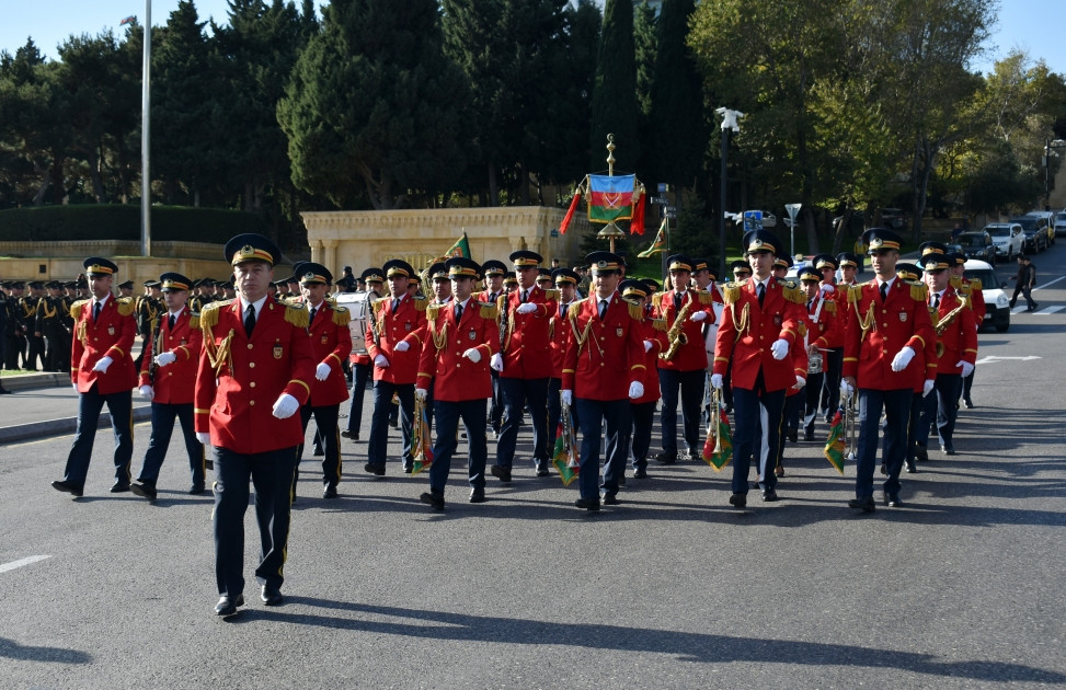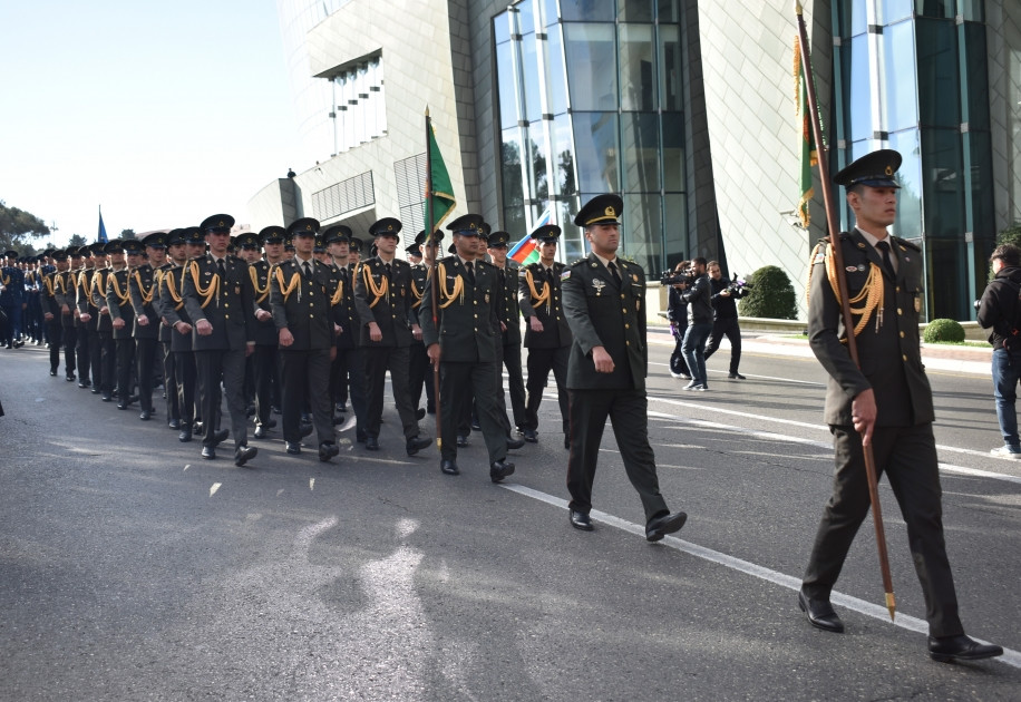 Затем военные оркестры исполнили Государственный гимн Азербайджана, после чего началось шествие военных.