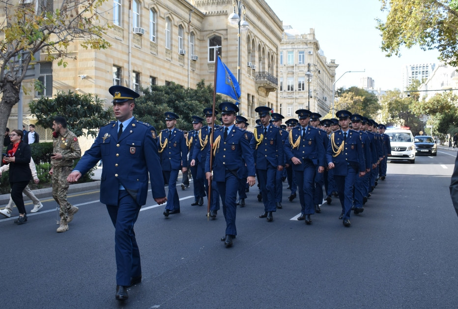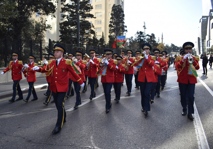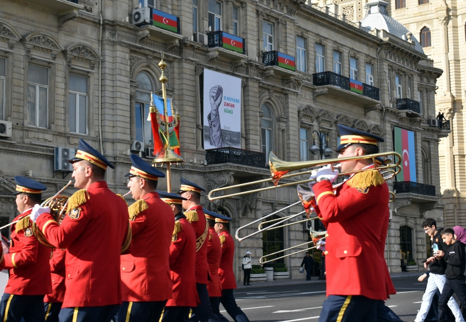 В Баку в сопровождении военных оркестров началось триумфальное шествие военнослужащих по случаю 8 Ноября - Дня Победы.