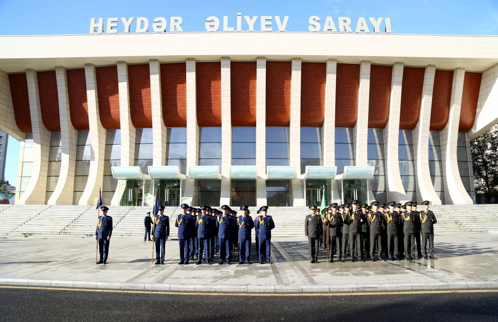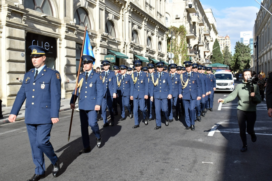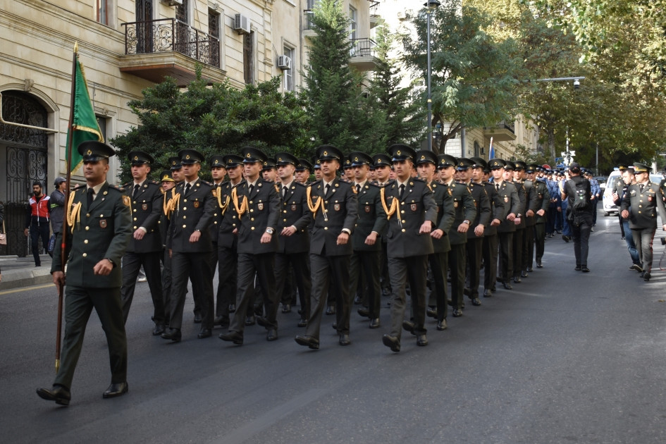 Военнослужащие в сопровождении военных оркестров шествуют по маршруту Дворец Гейдара Алиева - проспект Бюльбюля - Киноцентр Низами - проспект Нефтчиляр - площадь Азадлыг - торговый центр AMAY.