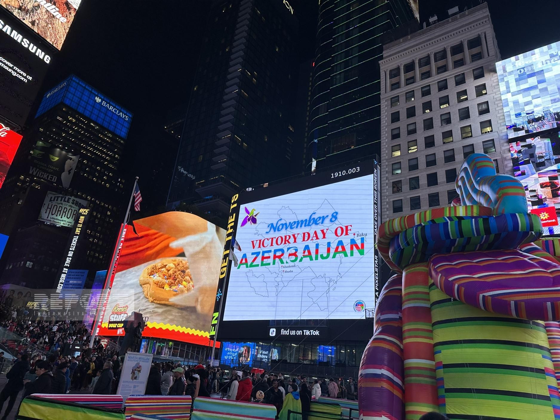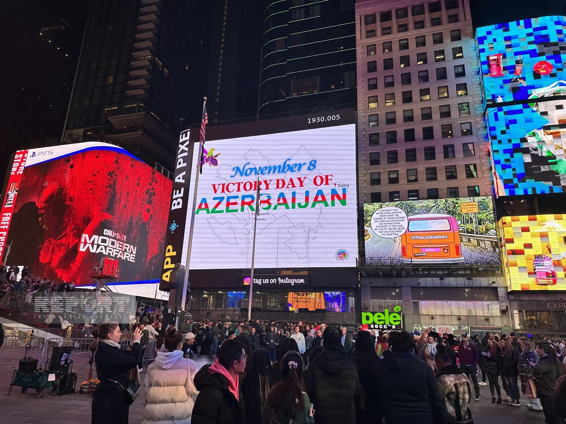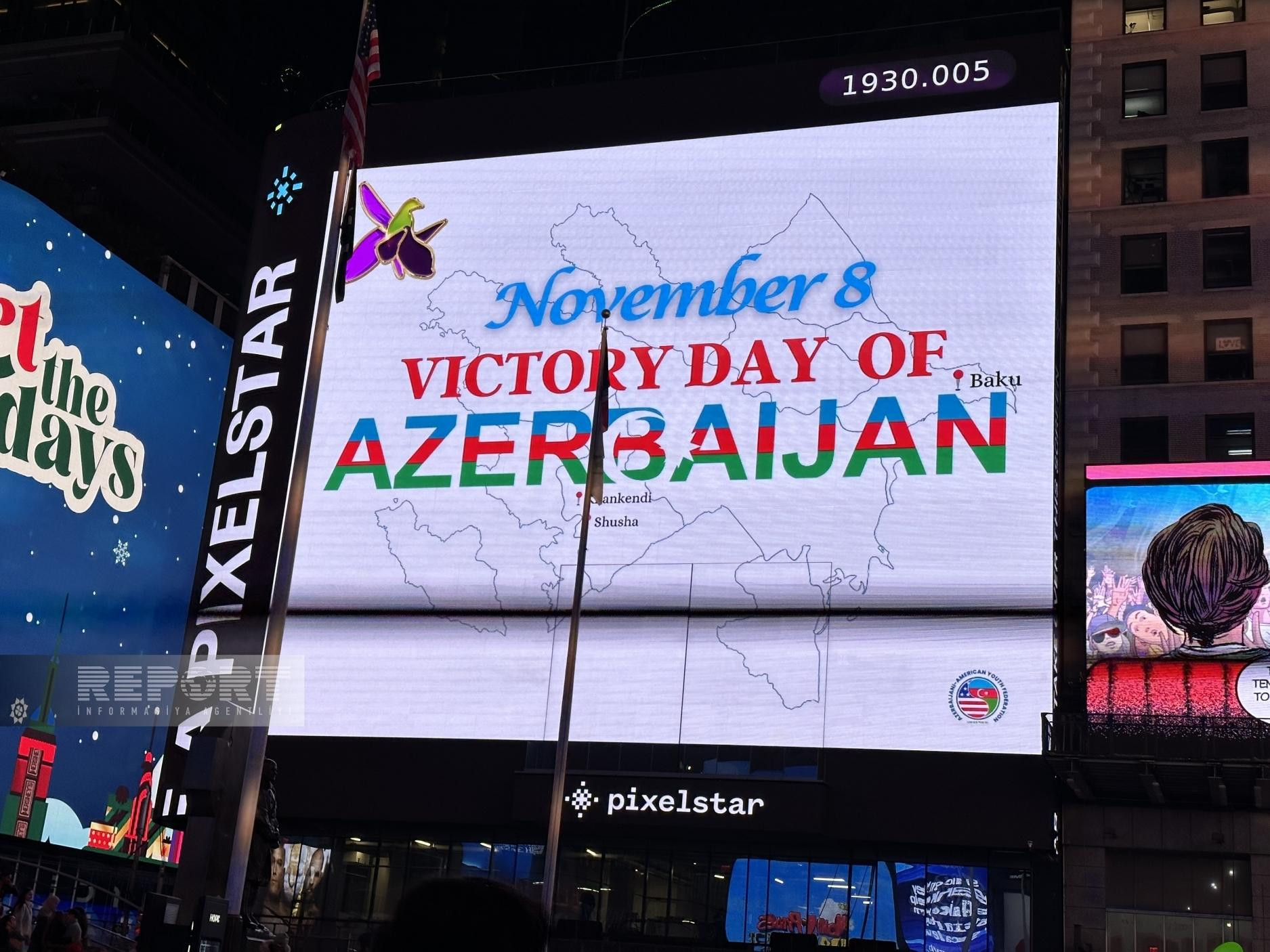 В рамках акции, на огромных мониторах на "Таймс Сквер", которая считается символом Нью-Йорка и которую ежедневно посещают тысячи туристов, была высвечена запись "8 Ноября – День Победы Азербайджана!", а также карта Азербайджана и символ победы в Отечественной войне - цветок харыбюльбюль (Офрис кавказская).