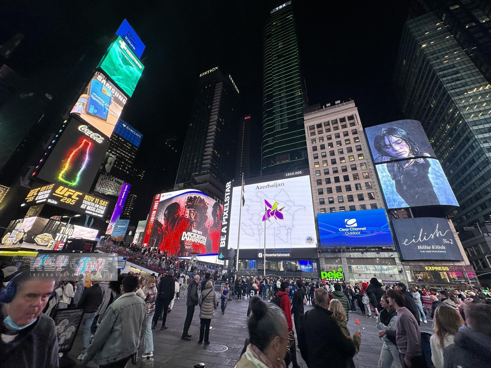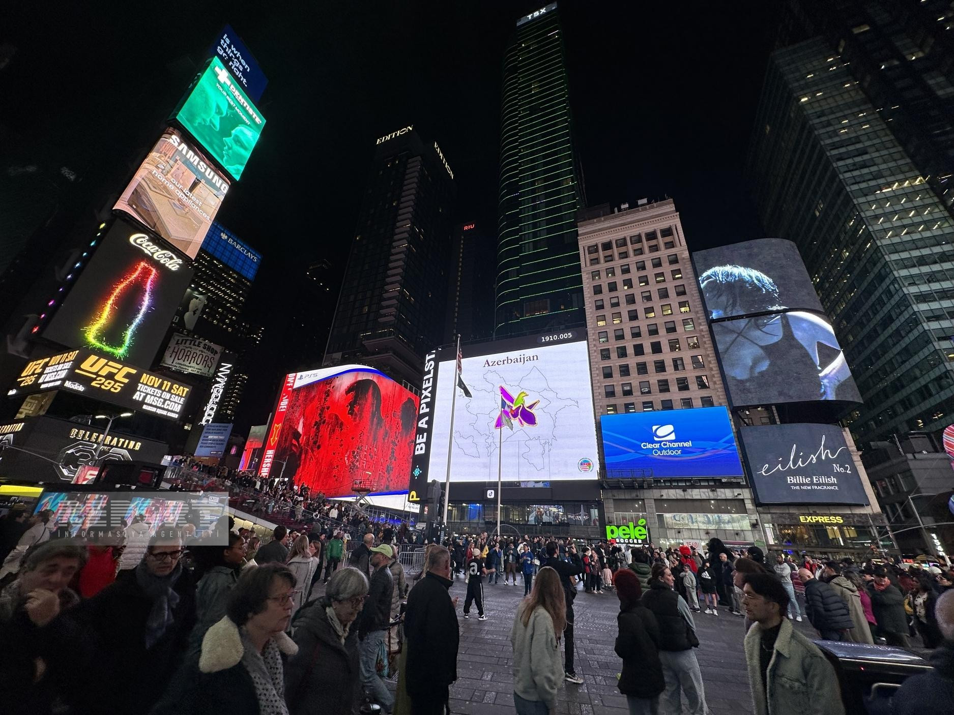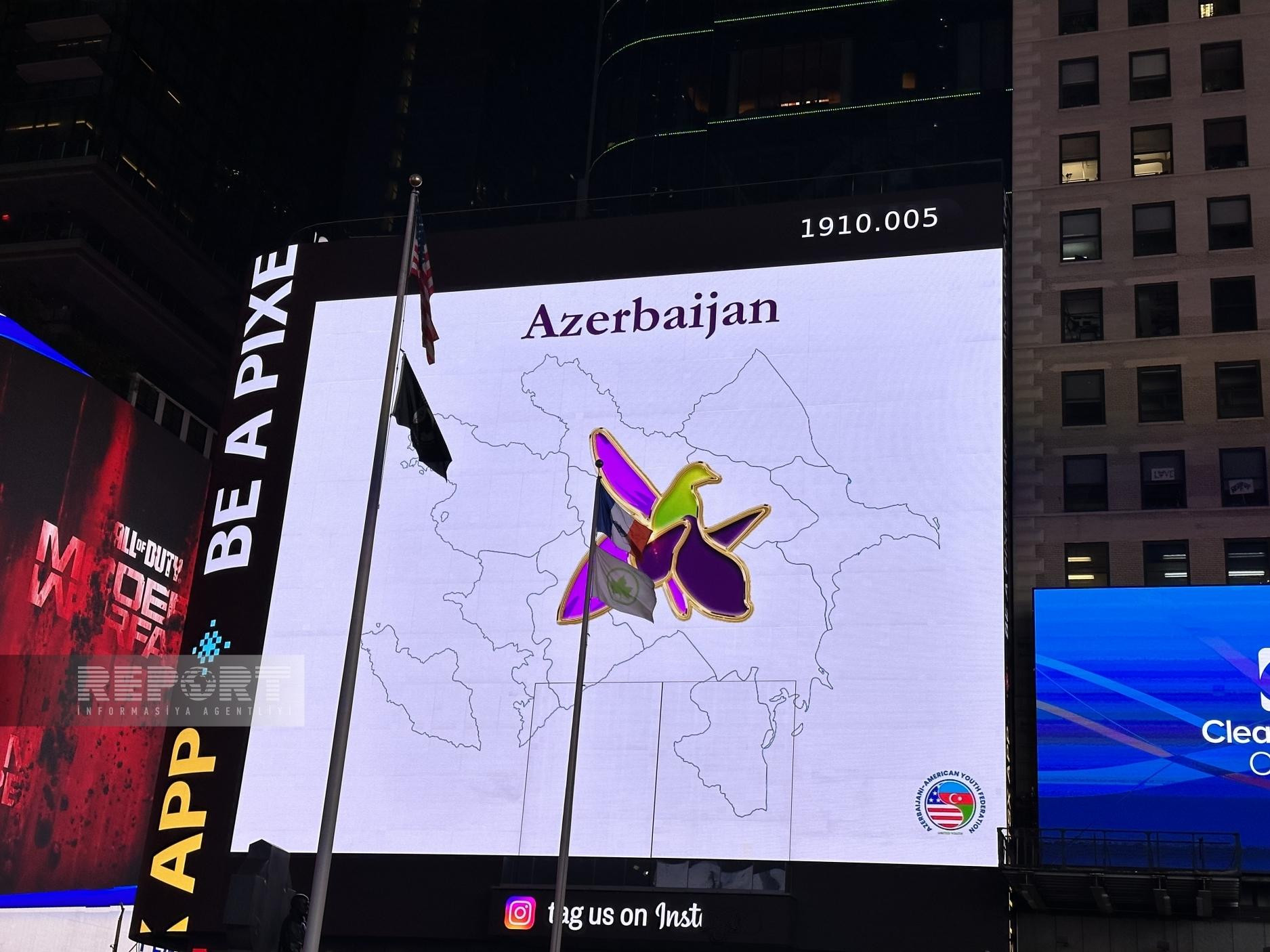 В рамках акции, на огромных мониторах на "Таймс Сквер", которая считается символом Нью-Йорка и которую ежедневно посещают тысячи туристов, была высвечена запись "8 Ноября – День Победы Азербайджана!", а также карта Азербайджана и символ победы в Отечественной войне - цветок харыбюльбюль (Офрис кавказская).