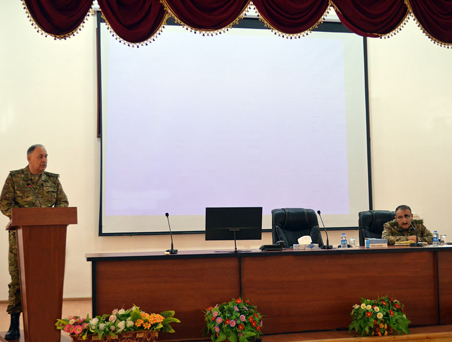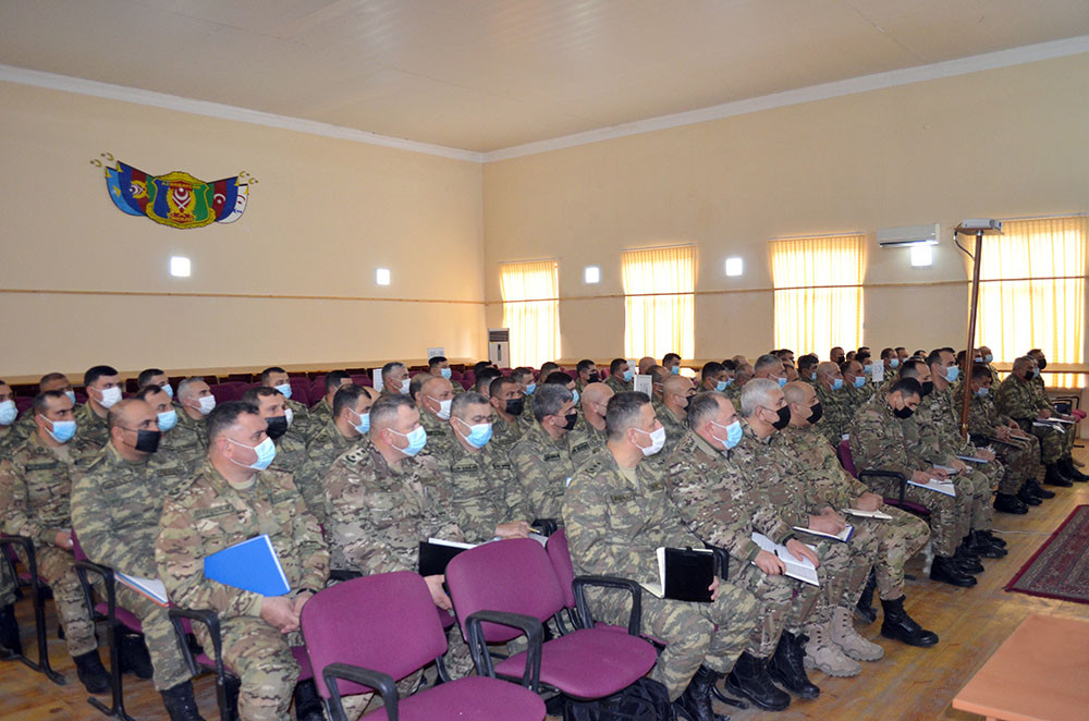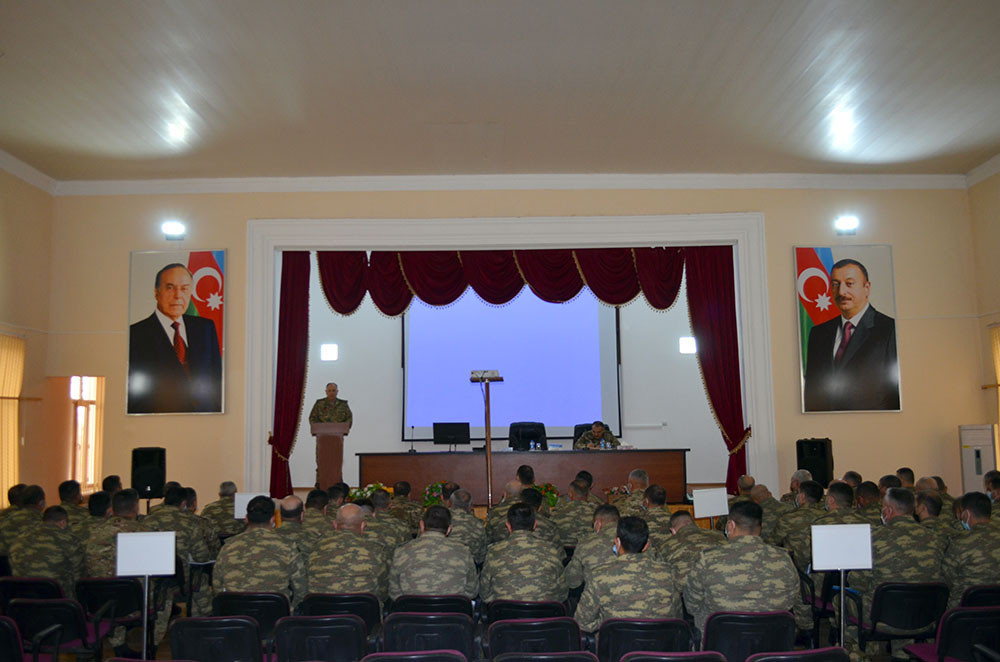 Daha sonra komandir heyətinin iştirakı ilə xidməti müşavirə keçirilib, Ali Baş Komandanın Azərbaycan Ordusu qarşısında qoyduğu tapşırıqlar şəxsi heyətin diqqətinə çatdırılıb. Bölmələrin döyüş qabiliyyətinin daha da yüksəldilməsi, komandir heyətinin bilik və bacarıqlarının təkmilləşdirilməsi, eləcə də silahlanmaya yeni qəbul edilən silah, texnika və cihazların imkanlarının öyrənilməsi, Vətən müharibəsində qazanılan təcrübə ilə yanaşı, müasir döyüş aparma üsulları nəzərə alınmaqla təlimlərin real döyüş şəraitinə uyğun davam etdirilməsi, həmçinin bayram günlərində ayıq-sayıqlığın artırılması ilə əlaqədar müvafiq göstərişlər verilib.