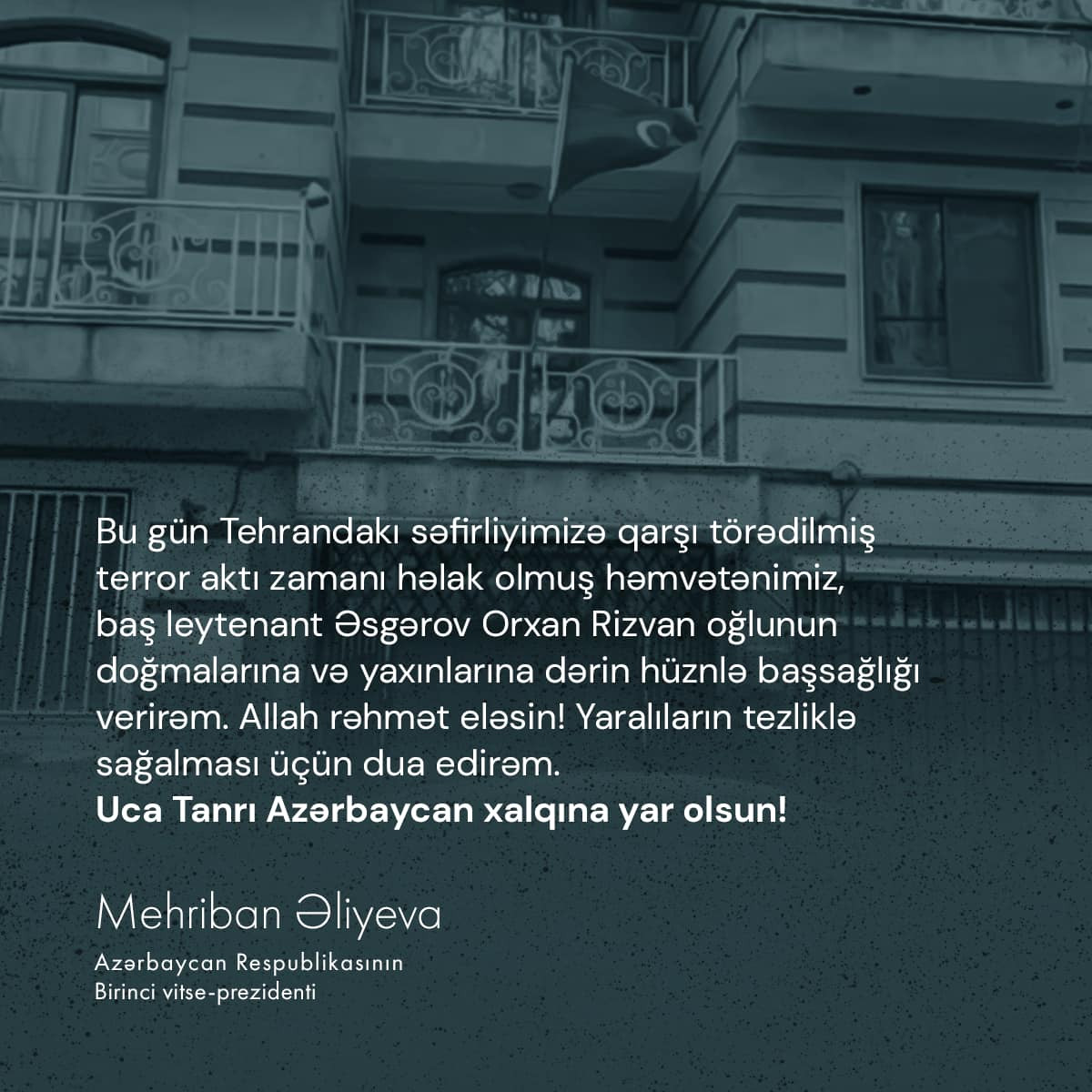 Azərbaycan Respublikasının Birinci vitse-prezidenti Mehriban Əliyeva rəsmi instaqram səhifəsində ölkəmizin İrandakı səfirliyinə silahlı hücumla bağlı paylaşım edib.