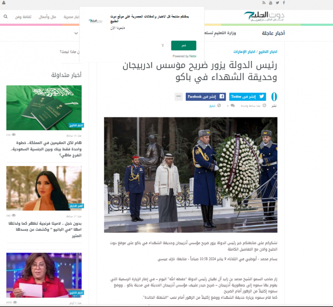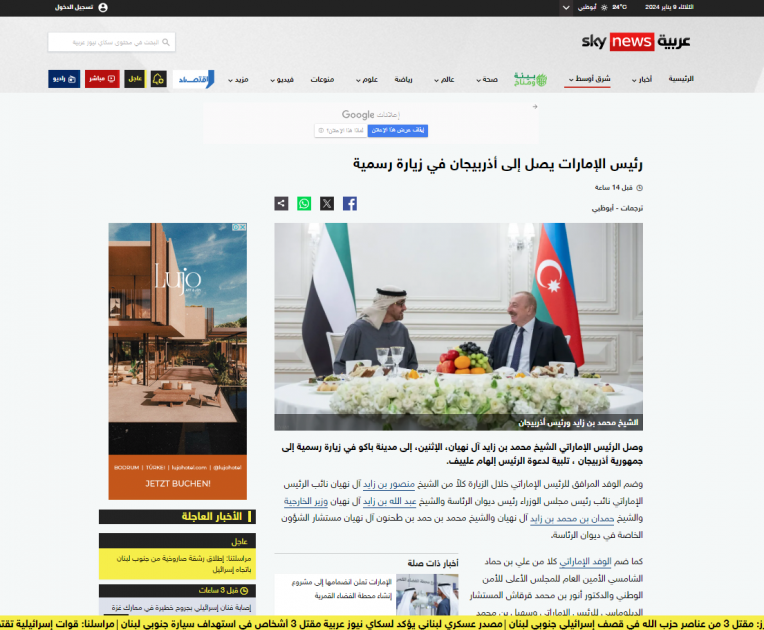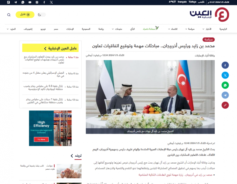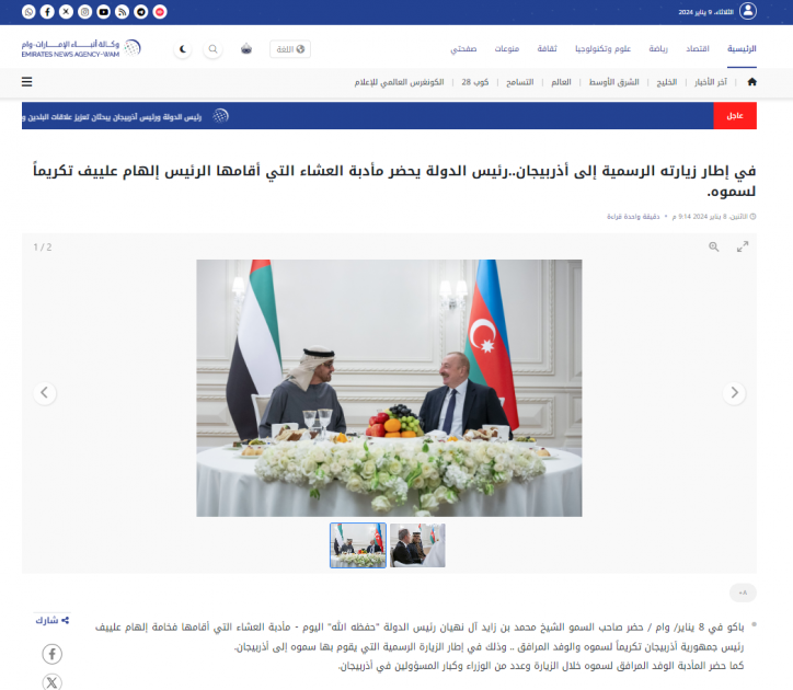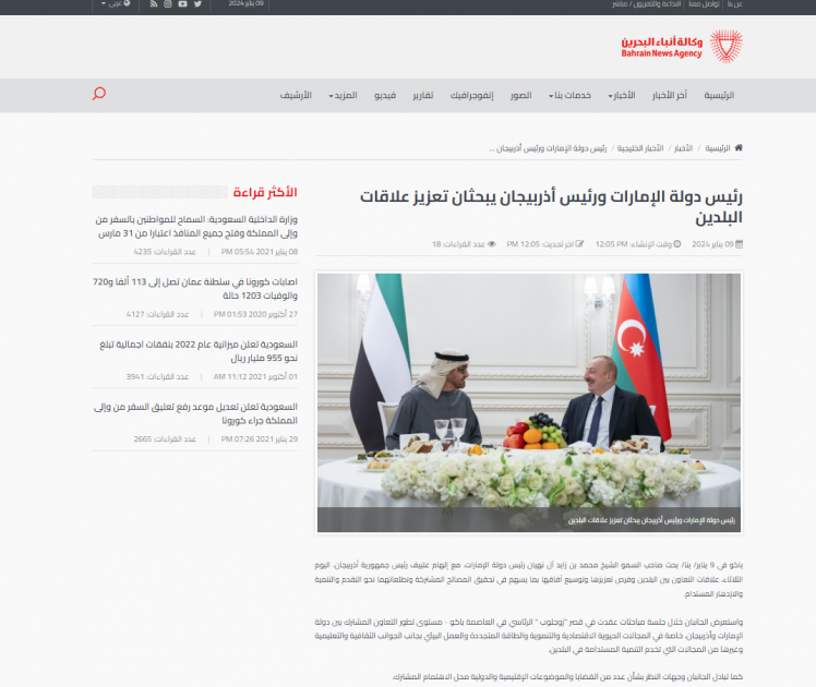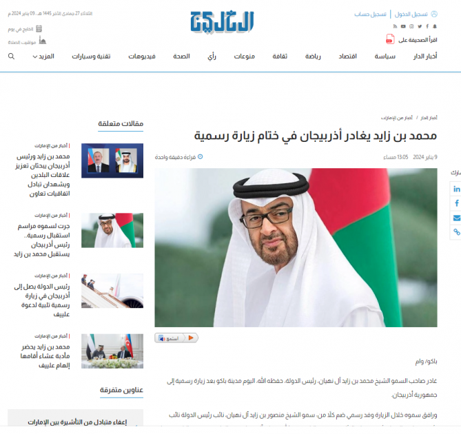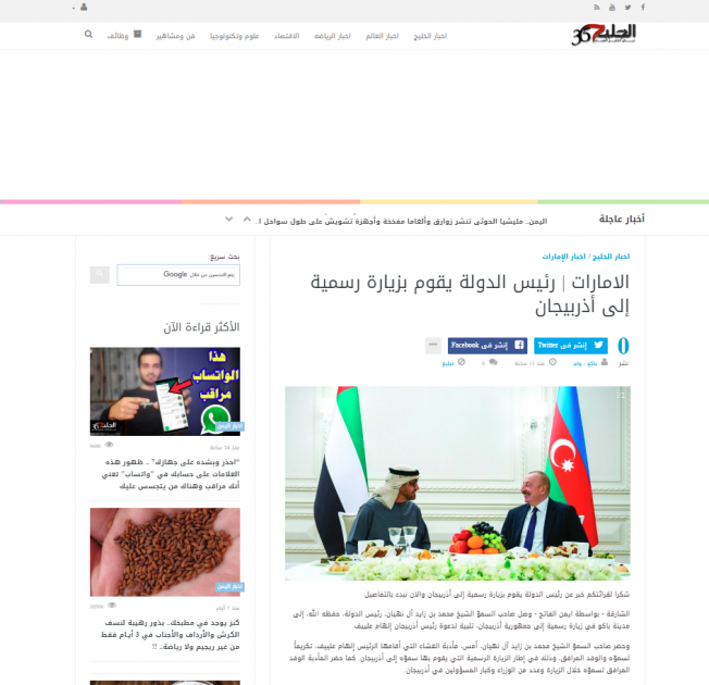 Birləşmiş Ərəb Əmirliklərinin (BƏƏ) Prezidenti Şeyx Məhəmməd bin Zayed Əl Nəhyanın Bakıya rəsmi səfəri çərçivəsində Azərbaycan Prezidenti İlham Əliyev ilə keçirdiyi görüşlər ərəb ölkələrinin mediası tərəfindən geniş işıqlandırılıb.