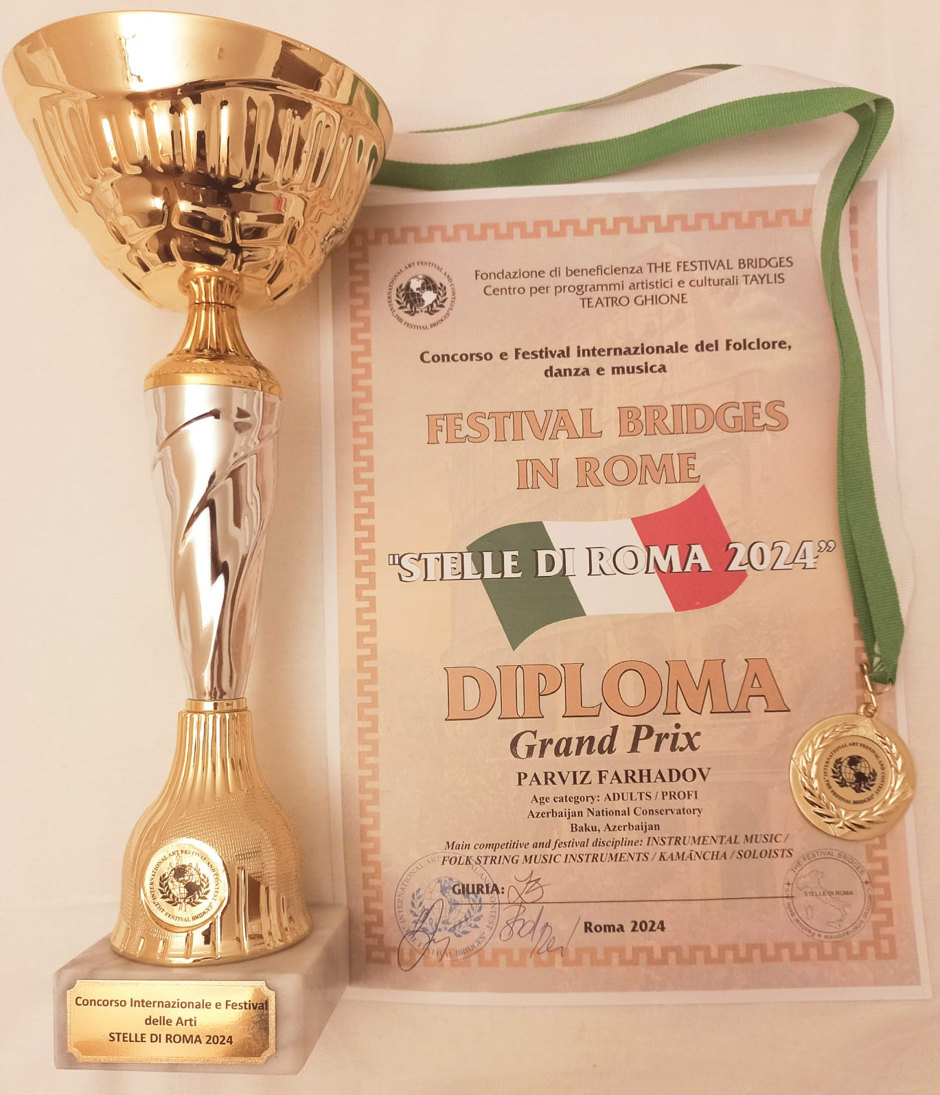 İtalyanın Roma şəhərində UNESCO Avropa Folklor Musiqi Festivalları Assosiasiyası (EAFF) və BRİDGES Festivalları Fondunun təşkil etdiyi "STELLE DI ROMA 2024" Beynəlxalq Müsabiqəsində ölkəmizi təmsil edən kamança ifaçısı Pərviz Fərhadov müsabiqənin "Grand Prix" mükafatına layiq görülərək diplom, medal və festivalın kuboku ilə təltif edilib.