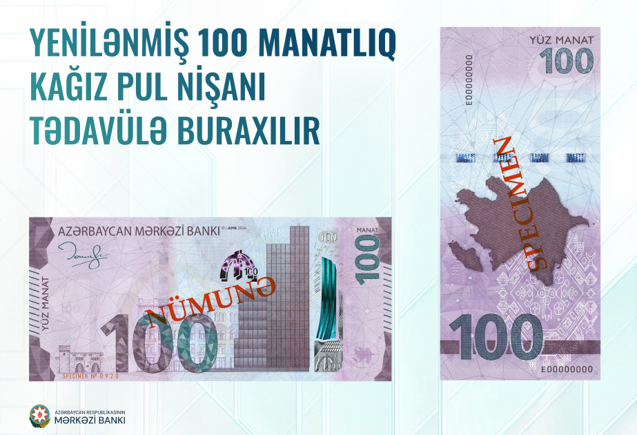 Azərbaycan Mərkəzi Bankı yenilənmiş dizayna və ən son mühafizə elementlərinə malik 100 manatlıq pul nişanının 15 iyul 2026-cı il tarixindən tədavülə buraxılmasını elan edir.
