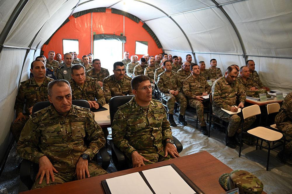 Colonel General Zakir Hasanov attended the command and control post deployed in field conditions and inspected the organization of activities. The minister heard the reports of the commanders and staff officers about the decisions made on the map of the area during the operations.
