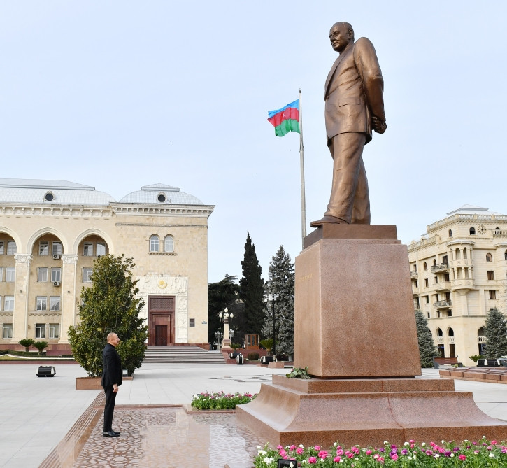 Глава государства посетил возведенный в центре города памятник общенациональному лидеру нашего народа Гейдару Алиеву и возложил к нему цветы.