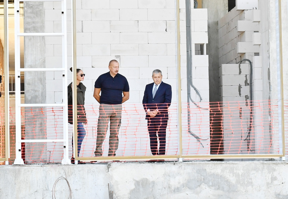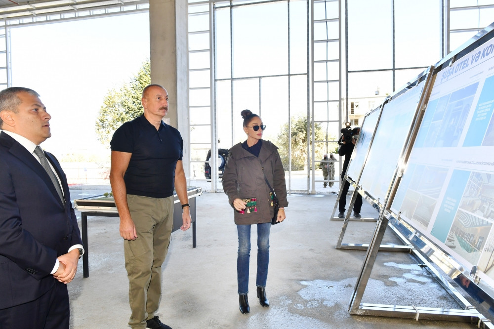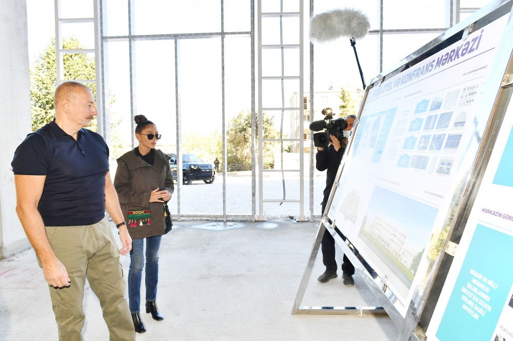 Президент Азербайджанской Республики Ильхам Алиев и первая леди Мехрибан Алиева ознакомились с ходом строительных работ, проводимых в отеле и конференц-центре в городе Шуша.