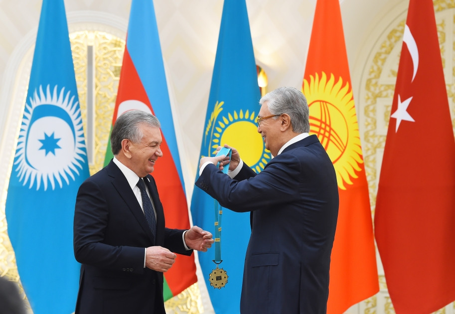 Президент Казахстана Касым-Жомарт Токаев вручил Президенту Узбекистана Шавкату Мирзиёеву Высший орден тюркского мира за большие заслуги в развитии тюркских народов.
