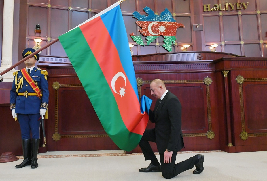 Преклонив колено, Президент Ильхам Алиев поцеловал государственный флаг Азербайджана.