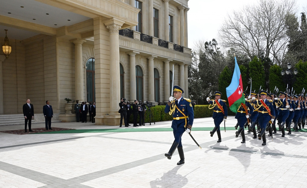 Под звуки военного марша почетный караул прошел перед Президентом Азербайджана Ильхамом Алиевым и Президентом Конго Дени Сассу-Нгессо.