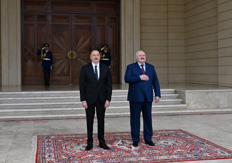 Под звуки военного марша почетный караул прошел перед Президентом Азербайджанской Республики Ильхамом Алиевым и Президентом Республики Беларусь Александром Лукашенко.